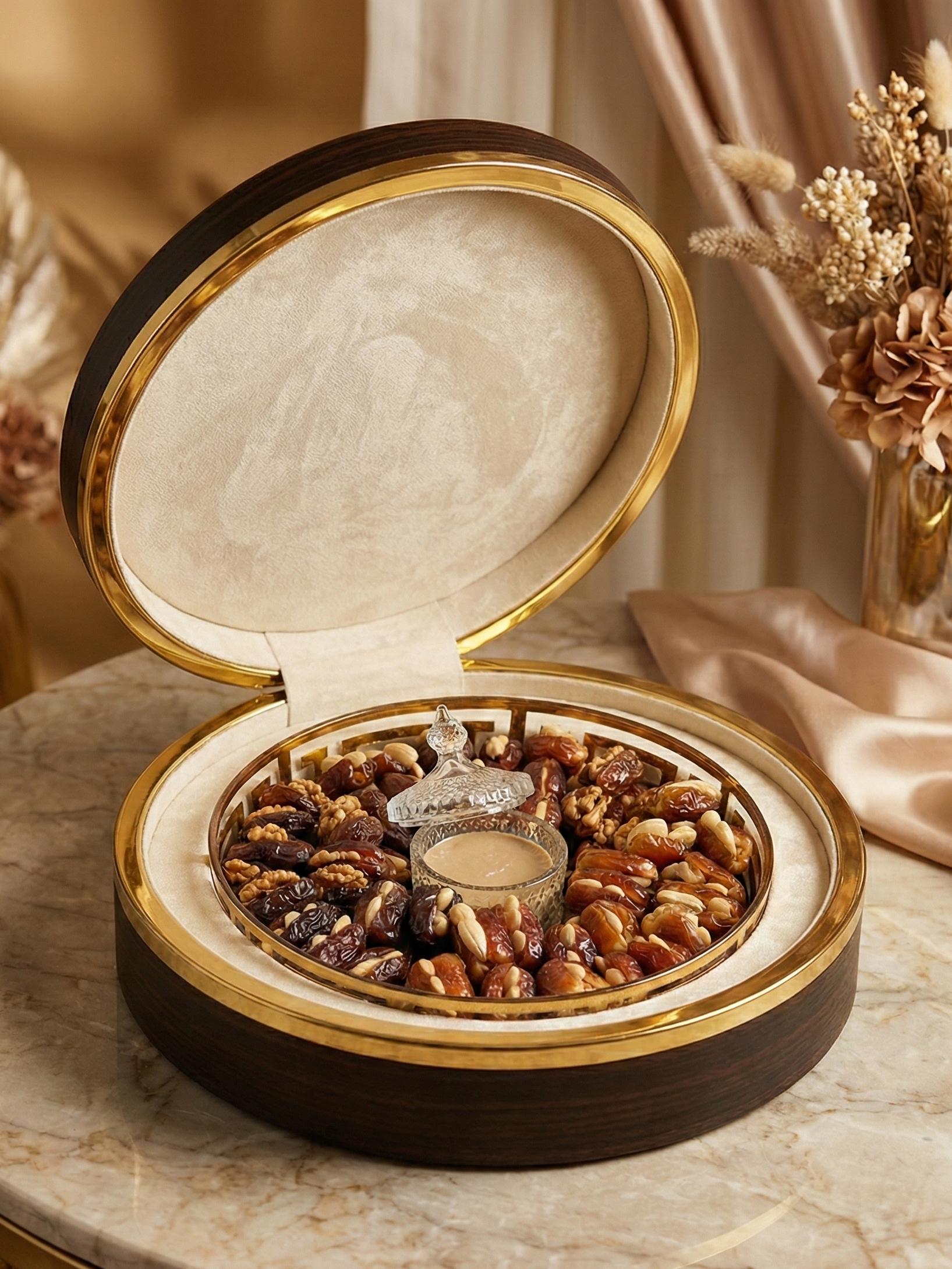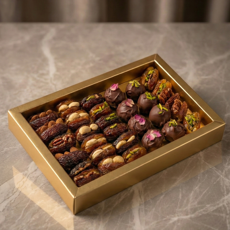 Sweetness crafted for you. Includes: • 3 Nut-Filled Dates • 3 Chocolates (Your choice: White, Dark, or Milky) Price: 2 OMR Click to order