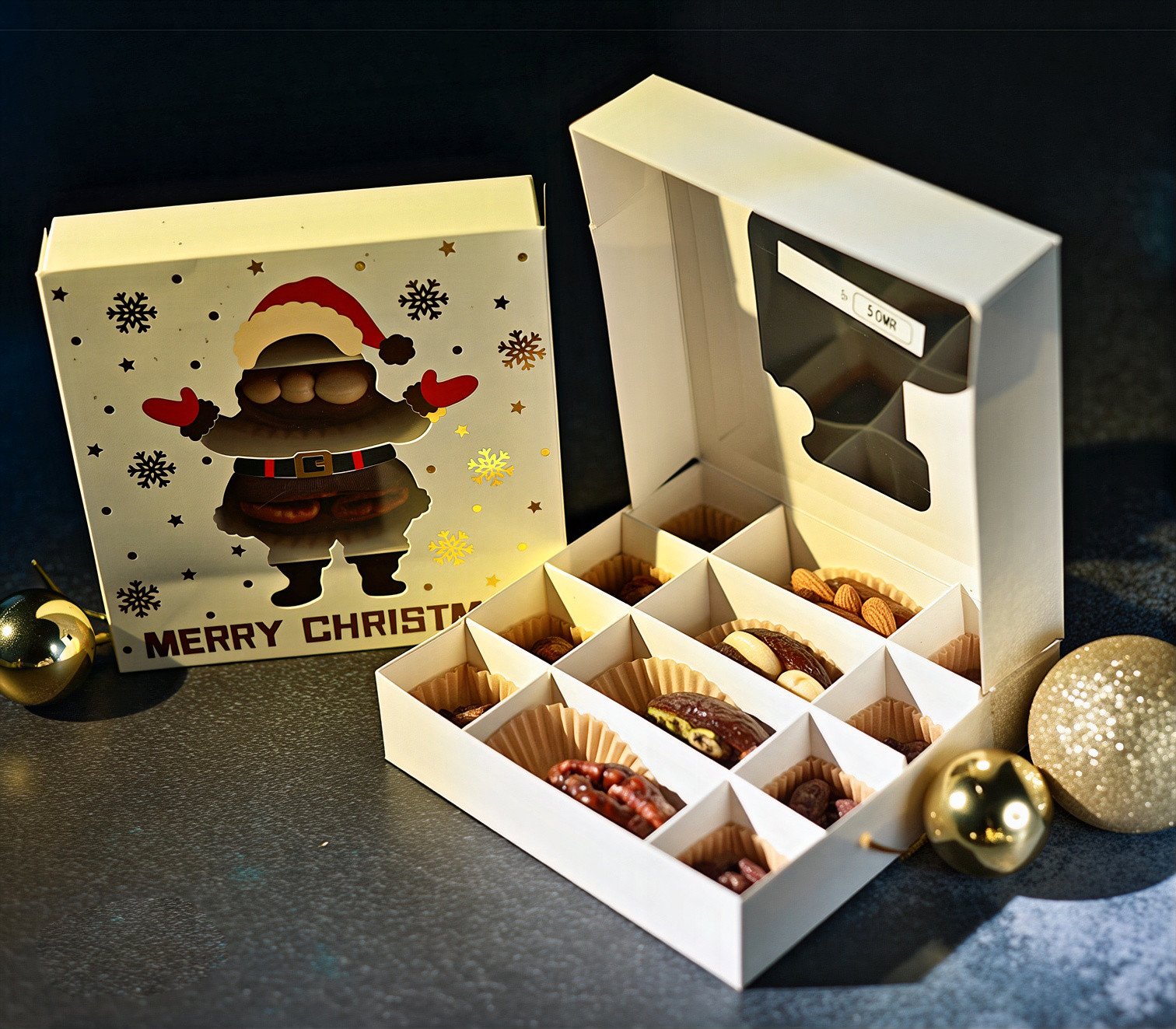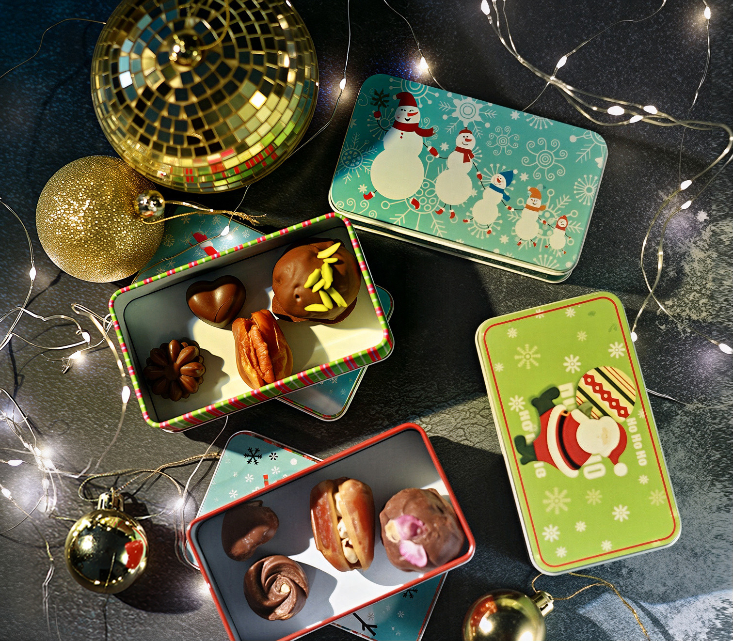 The ultimate festive collection! Includes: • 4 Nut-Filled Dates • 8 Mixed Chocolates (White, Dark, Milky - or customize your mix!) Price: 4 OMR Click to order